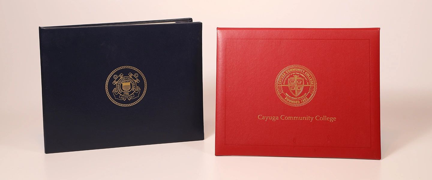 In stock for immediate shipment to hold 8.5 x 11” certificates in black, navy, burgundy and dark green. Holders feature padded front and back covers with a white moire panel to hold one or two certificates.